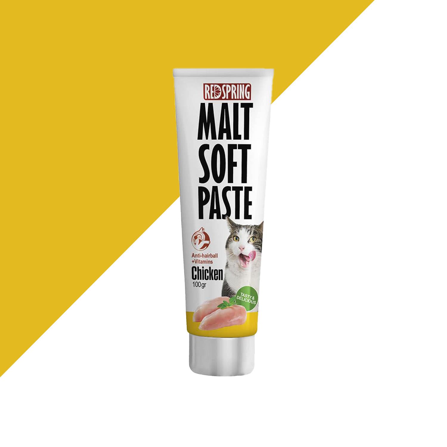 خمیر مالت گربه رد اسپرینگ با طعم گوشت مرغ یک مولتی ویتامین بوده که کاریرد اصلی برای دفع موهای جمع شده در روده است که موجب انسداد روده شده است.