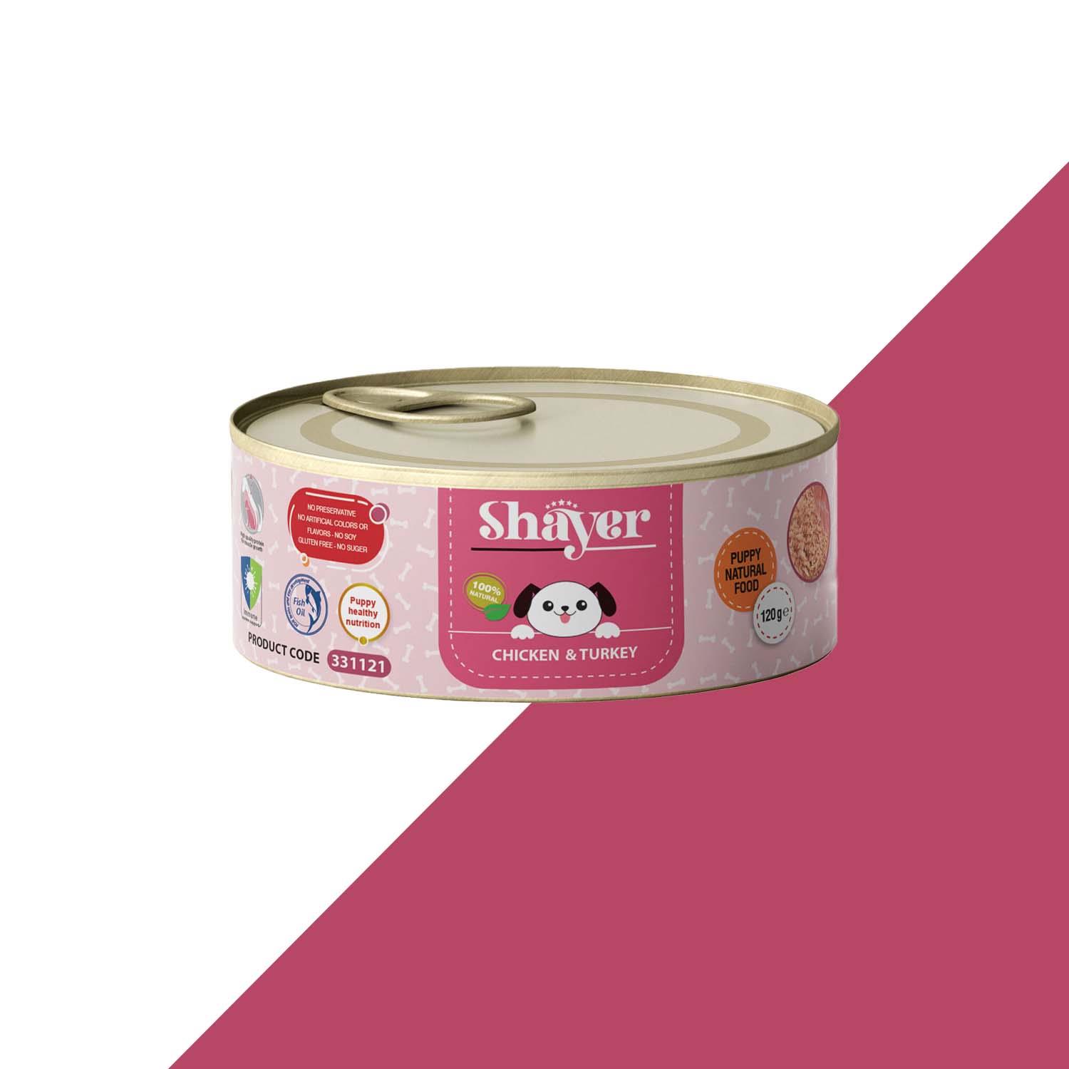 کنسرو پاپی “شایر” با طعم مرغ و بوقلمون حاوی امولسیون یکنواخت شدهی گوشت گوساله، مرغ، جگر و شتر مرغ و بوقلمون همراه با کمی برنج، هویج، نخود سبز، کلم و استخوان میباشد. مقدار قابل ملاحظهای از امگا ۳ و ۶ موجود در این کنسرو به نگهداری و سلامت پوست و مو و همچنین رشد مو کمک قابل توجهی مینماید.
