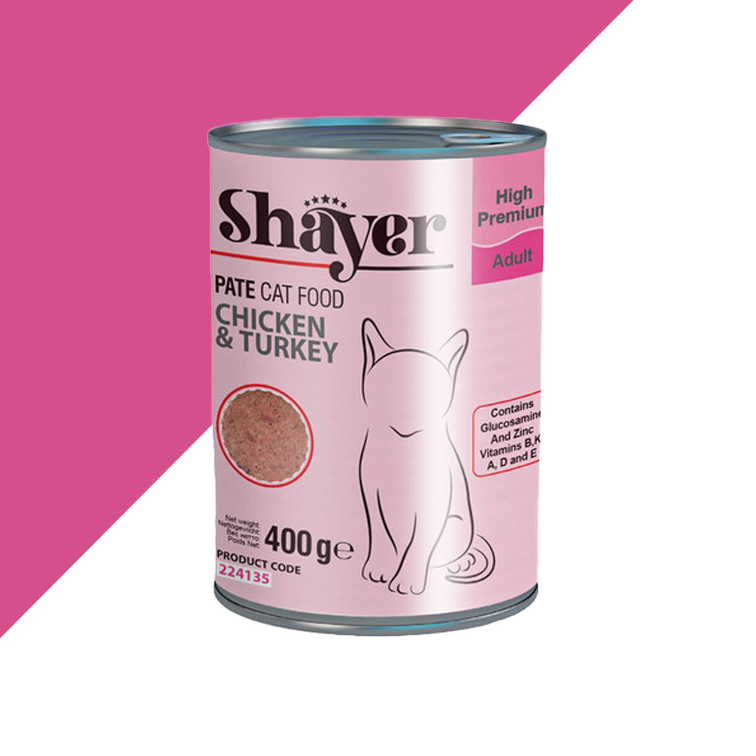 کنسرو گربه شایر حاوی پاته گوشت مرغ و بوقلمون همراه با جگر، کمی برنج، هویج، نخود سبز، کلم و استخوان میباشد. گوشت مرغ و بوقلمون به دلیل وجود مواد معدنی و ویتامینهای لازم و آنتی اکسیدان سلنیوم فراوان، برای تیروئید، متابولیسم و تقویت سیستم ایمنی ضروری میباشند و سلامت قلب و عروق را بهبود میبخشند و مانع از اختلالات پوستی میشوند.