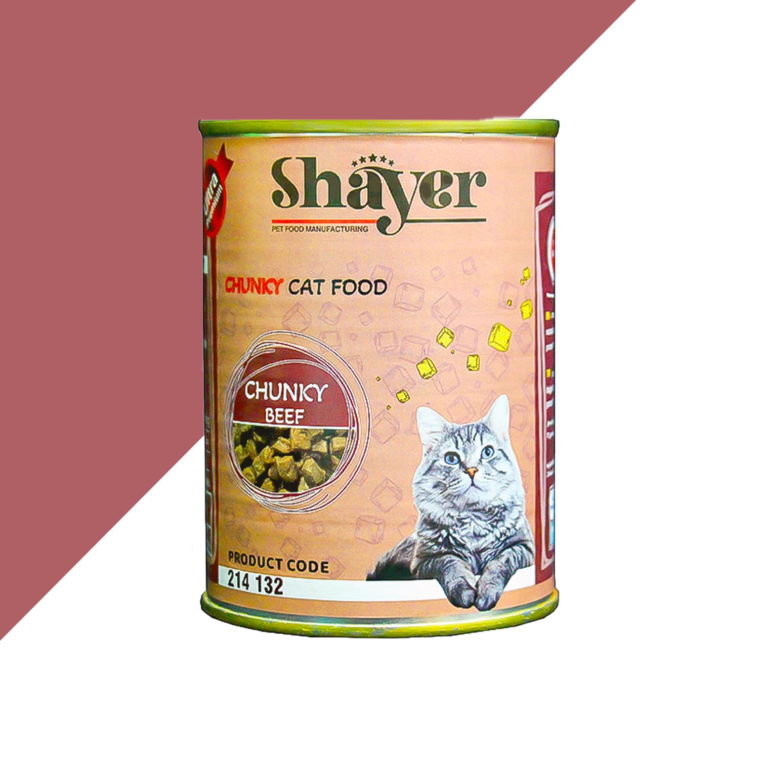 ترکیبات تشکیل دهنده کنسرو شایر چانکی با طعم گوشت شامل گوشت تازه قرمز، برنج، سیب زمینی و آب گوشت غلیظ شده میباشد که علاوه بر طعم لذیذ و پرطرفدار آن، سرشار از ویتامینهای مورد نیاز بدن گربه میباشد. گوشت تازه استفاده شده در این محصول منبع اصلی آهن و پروتئین میباشد که کمک بسزایی در تشکیل عضلات، خون و اکسیژن و قلب و عروق گربه را دارد. همچنین طعم گوشت دلپذیر و لذیذش آن را به بهترین و پرطرفدارترین در بین گربههای بازیگوش کرده است.